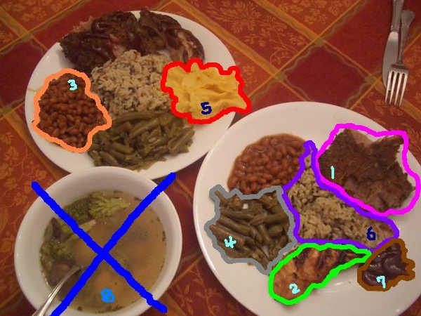 台灣人重湯頭(看現在的火鍋店動不動就是八九種不同的湯底就可以看出),但是美國人才不在乎什麼湯不湯頭的【鐵證在此】。就算是已經這樣濃稠的湯品,他們還要丟幾片麵包進去,把它搞的紮紮實實,Derek老愛說台灣的湯其實就是煮滾的白開水裡浮個幾片青菜的葉子,剛開始聽有點不以為然,但是仔細一觀察,還真是有幾分道理。大家想想我們去買飯阿麵阿時的附湯,絕大多數真的都是白開水裡飄了幾片葉子阿!